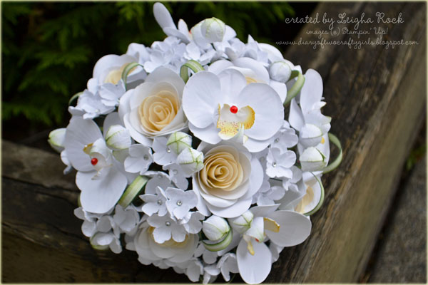 And this is the bouquet I created out of paper. To create this bouquet, I used both my original Paper Orchid Tutorial and my original Summer Bouquet Tutorial. I simply changed up the colours a bit, and put them together. Wouldn't you love to make it for someone special? Now you can! If you purchase both the original Paper Orchid Tutorial and the original Summer Bouquet Tutorial, I will also include a 6 page step-by-step Lynn's Bouquet Tutorial (lots of gorgeous pics here too) on how to do the colour variation for the wedding orchids, the creamy roses, the white hydrangea, and beargrass, as well as how to make and assemble the bouquet. (Of course, as always, the Paper Orchid Tutorial and the Summer Bouquet Tutorial will continue to be available seperately).